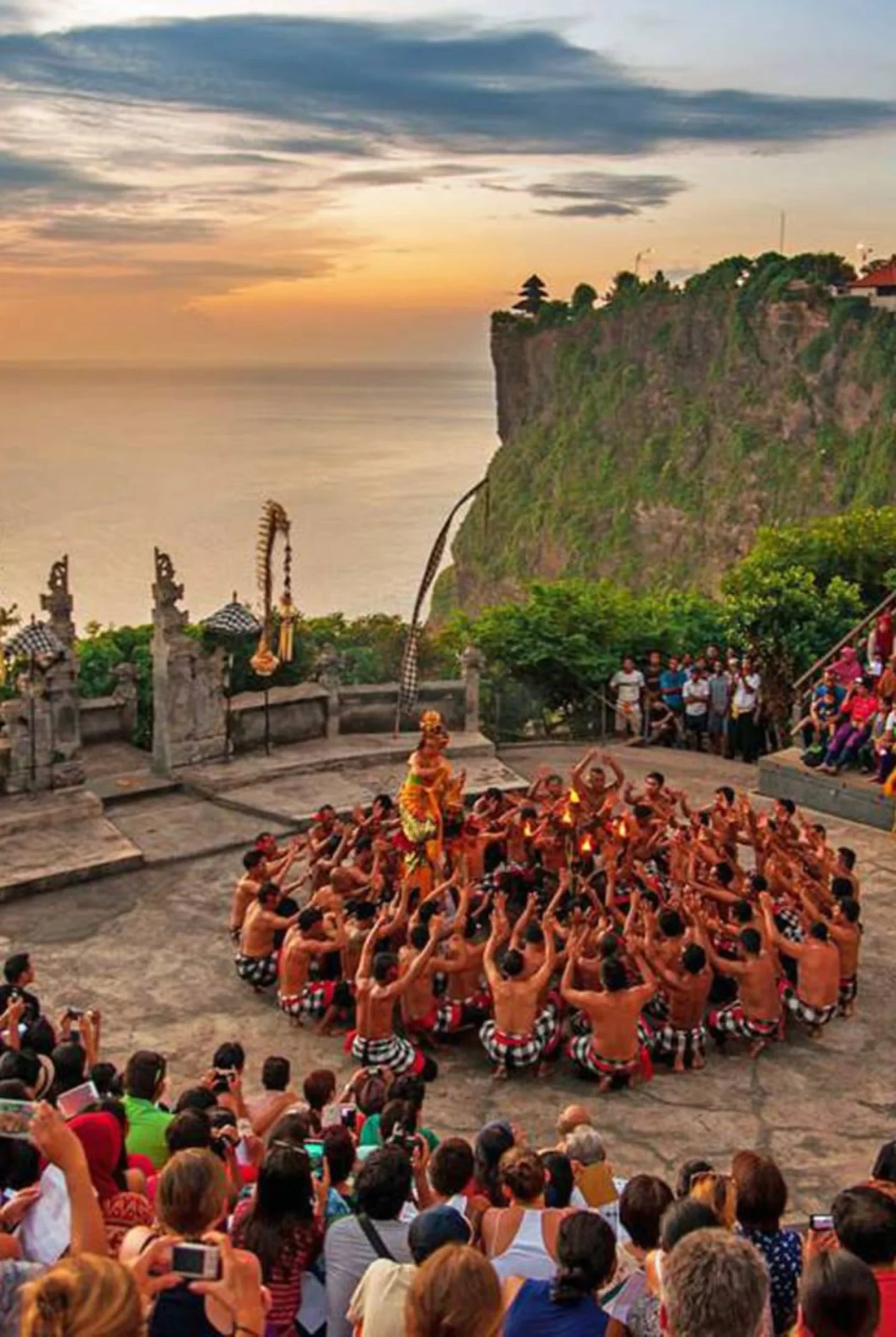 As the sun sets, enjoy the world-famous Kecak & Fire Dance performance, a captivating traditional Balinese show featuring rhythmic chants and dramatic storytelling set against a golden sunset backdrop.